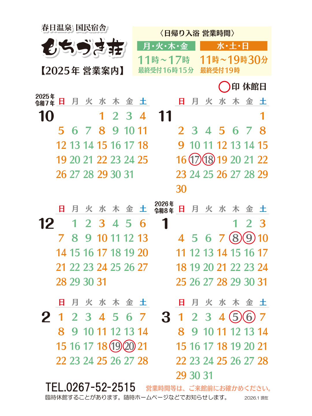 2月6日はにこにこ風呂の日♪ 2026年01月31日 【休館日のお知らせ】 2026年01月24日 どんど焼き 2026 2026年01月18日 日帰り入浴・ゴルフ練習場営業についてのお知らせ 2026年01月06日 2026年1月1日 2026年01月01日
