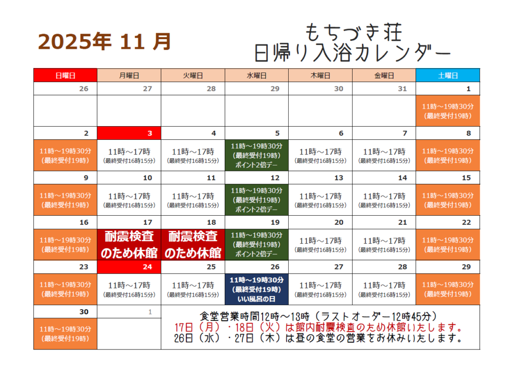 11月の日帰り入浴の営業予定をお知らせいたします。