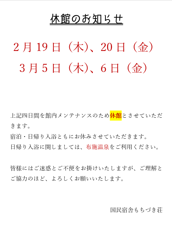 館内メンテナンスのため、2月19日(木)、2月20日(金)、3月5日(木)、3月6日(金)を、