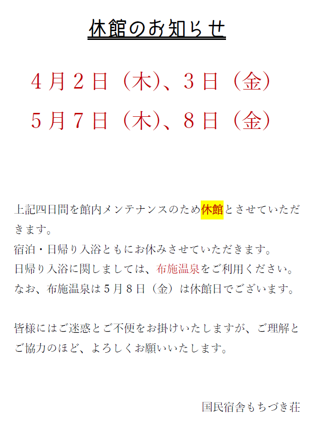 宿泊・日帰り入浴・食堂営業・売店営業等すべてお休みさせていただきます。