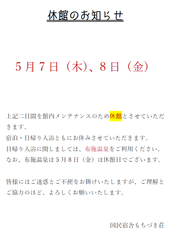 宿泊・日帰り入浴・食堂営業・売店営業等すべてお休みさせていただきます。